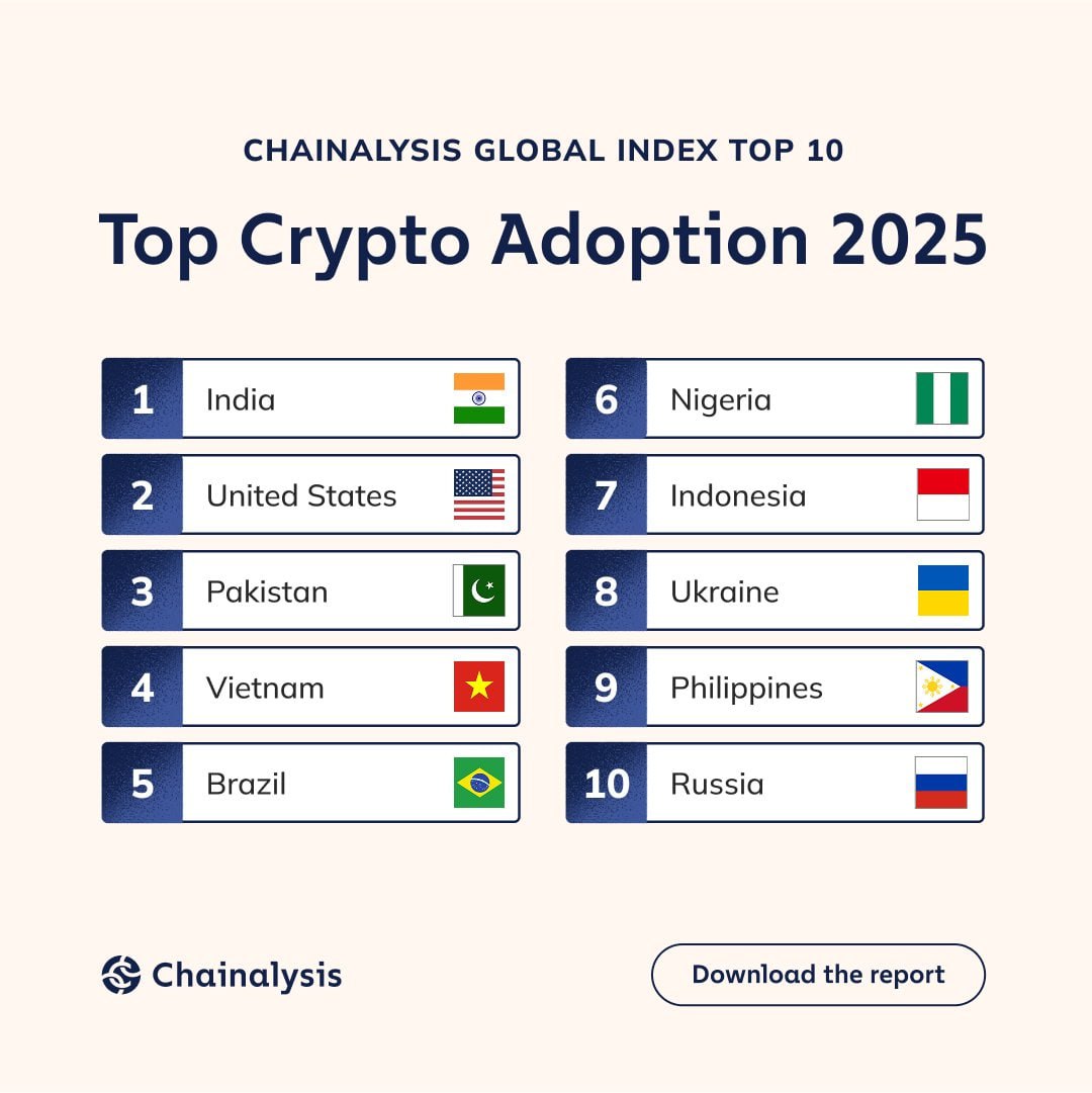 В индексе принятия криптовалют Chainalysis за 2025 год Россия заняла 10-е место. Лидируют Индия, США, Пакистан, Вьетнам и Бразилия, а основной рост…